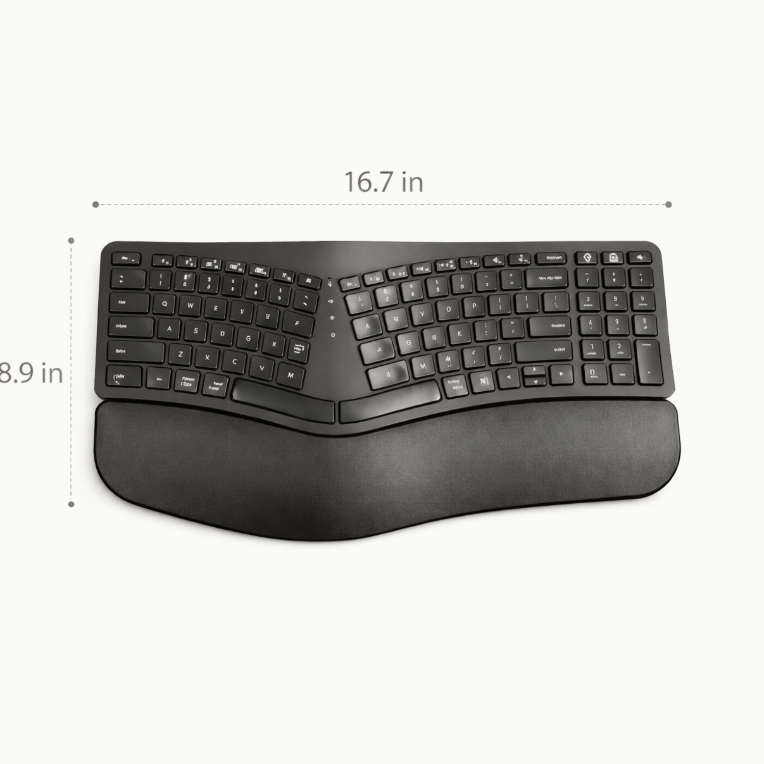 This ergonomic keyboard features a split and curved key layout designed to support a more natural hand and wrist position during typing. The angled design helps reduce inward wrist rotation that commonly occurs with traditional flat keyboards. A built-in contoured wrist rest provides additional support by allowing the hands to rest comfortably while typing. Together, these design elements help promote improved posture and reduce strain during extended periods of computer use in professional or home office environments.